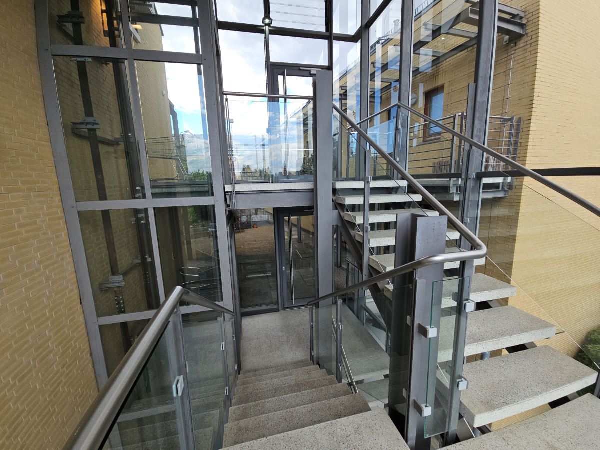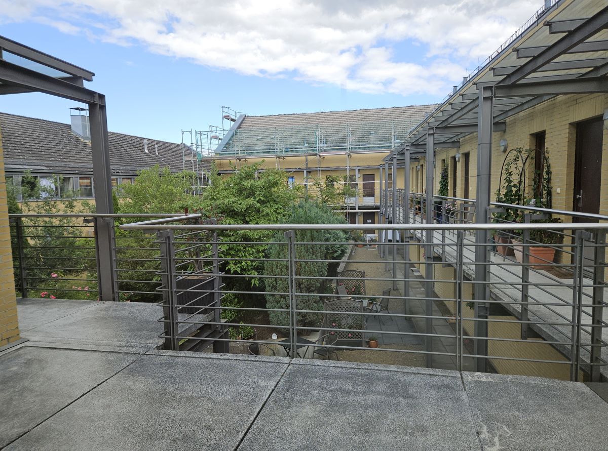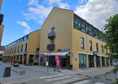 Die ruhige Maisonettewohnung befindet sich in der 2.Etage eines ungewöhnlich gebauten Wohn- und Geschäftshauses am Rande eines kleinen Einkaufszentrums. In der zweiten Etage befinden sich Wohnzimmer, Küche und Balkon, in der Etage darüber Schlaf- und Badezimmer. Zur Wohnung gehört ein Kellerabteil. Die Wohnung ist seit Januar 2004 vermietet.